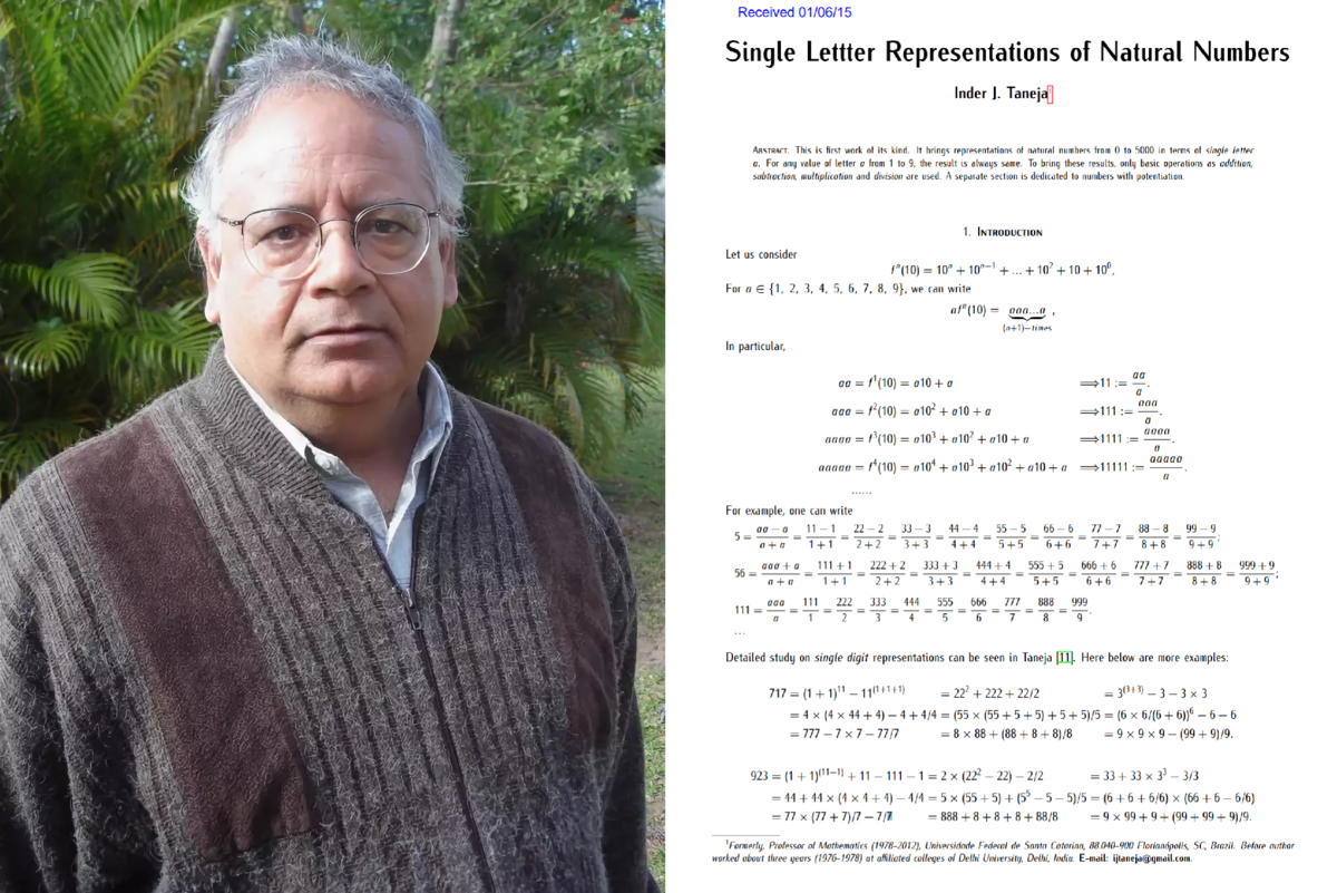 Приветствую Вас, уважаемые Читатели! Сегодня хочу без длинных вступлений рассказать Вам об одной статье, поразившей меня невероятным образом. Речь пойдет о статье бразильского математика Индера Танежи, которая касается представления любых натуральных чисел ОДНОЙ БУКВОЙ и знаками арифметических операций. Поехали!