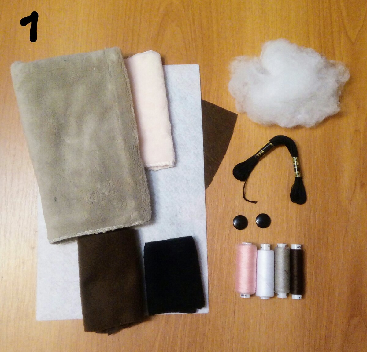 1. Для работы нам понадобятся: бежевая и розовая ткань (у меня мелковорсовый искусственный мех). Ткань черная и коричневая (у меня флис). Фетр - белый и коричневый. Нитки швейные - белые, розовые, коричневые, черные. Черные нитки мулине. Две средние черные пуговицы. Синтепон.