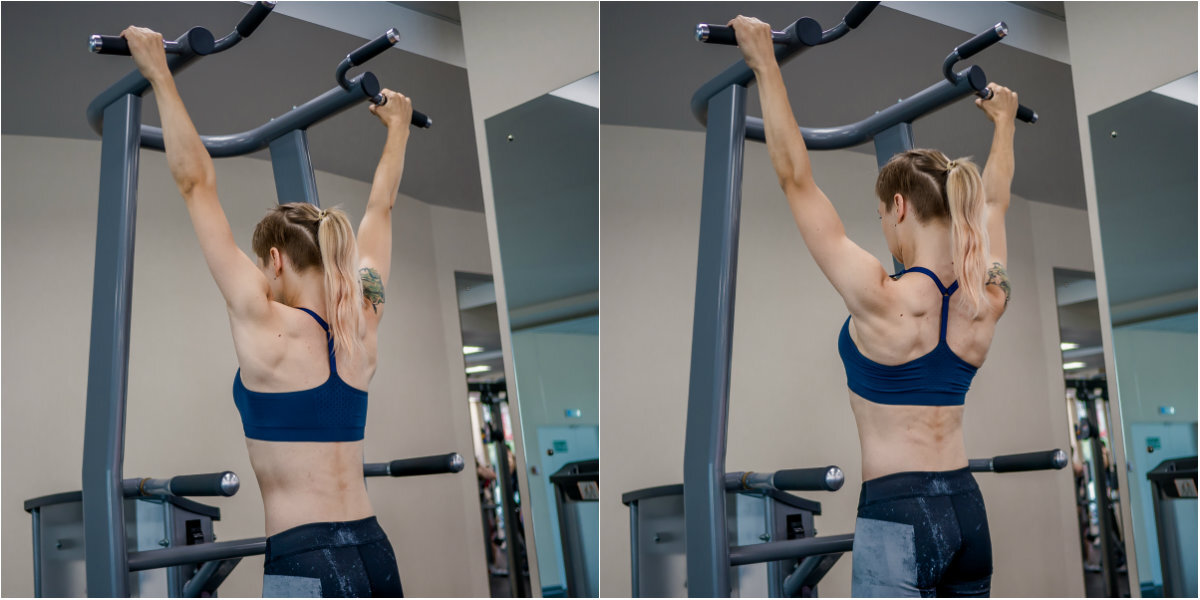Возьмитесь за турник прямым хватом так, чтобы ладони были чуть шире плеч. Повисните на прямых руках. Напрягите пресс, опустите плечи и сведите лопатки. Сохраняйте это положение 10–15 секунд. Повторите 5 раз.