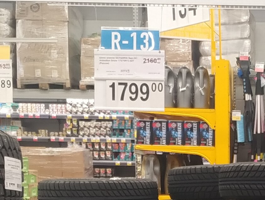 На всю резину была скидка, плюс неплохой бонус при покупке по карте "Лента". Начнем с самого недорого сегмента-это бренд "Белшина", не шипованные покрышки. В принципе по ощущениям не сильно мягкая, но и не сильно жесткая резина. К сожалению в размере R 13 вся резина была раскуплена, но я все равно покажу вам ценник и ее стоимость. В размере 175/70 R13 эта покрышка обошлась бы вам в 1799 рублей по карте, и 2273 рубля без карты.