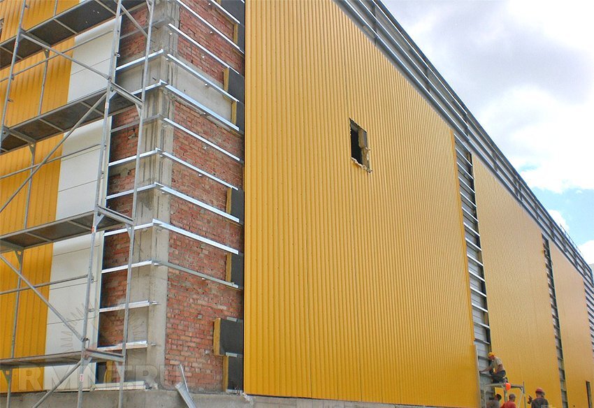 Такие фасады выполняются из различных отделочных материалов, но в данной статье рассмотрим устройство утепленного вентилируемого фасада из металлопрофиля.