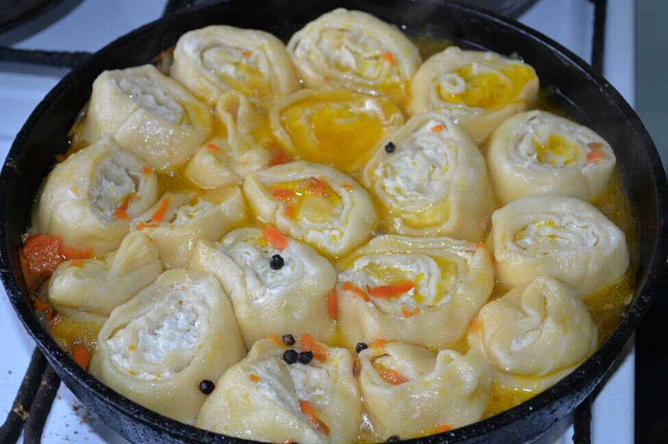 7. На овощную поджарку выложить кусочки рулета из теста с мясом, плотненько друг к другу. Влить горячую воду до середины рулетиков и прикрыв крышкой, тушить на слабом огне около получаса. После дать постоять под крышкой еще минут 10-15, и потом можно подавать на стол.