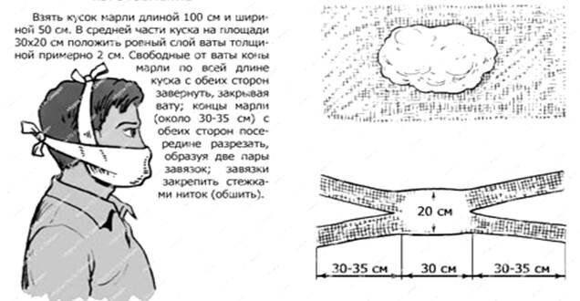 Самые простые маски можно сделать из марли, сложенной в несколько раз. Через три часа после использования такую маску лучше выкинуть, однако со своей функцией она вполне справится. Если же вам повезет найти хорошие плотные советские бинты, то сшитую из них повязку будет можно стирать с антибактериальным мылом и использовать повторно.