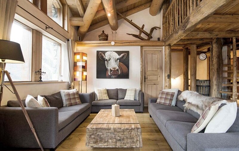Главным правилом для шале является целостная отделка, ключевую роль в которой играют камень и древесина. Для поддержания духа старины распространено использование состаренного древесного материала – это относится в том числе и к предметам мебели.