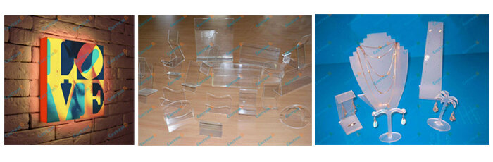 Из этого термопластичного пластика производят витрины, полки, держатели для товаров, стеллажи, подставки, стойки, световые короба, а также мебель и предметы интерьера. Световые боксы изготавливаются из нескольких материалов: боковые части из металла в сочетании с пластиком, а лицевая часть — молочный акрил, пропускающий свет.