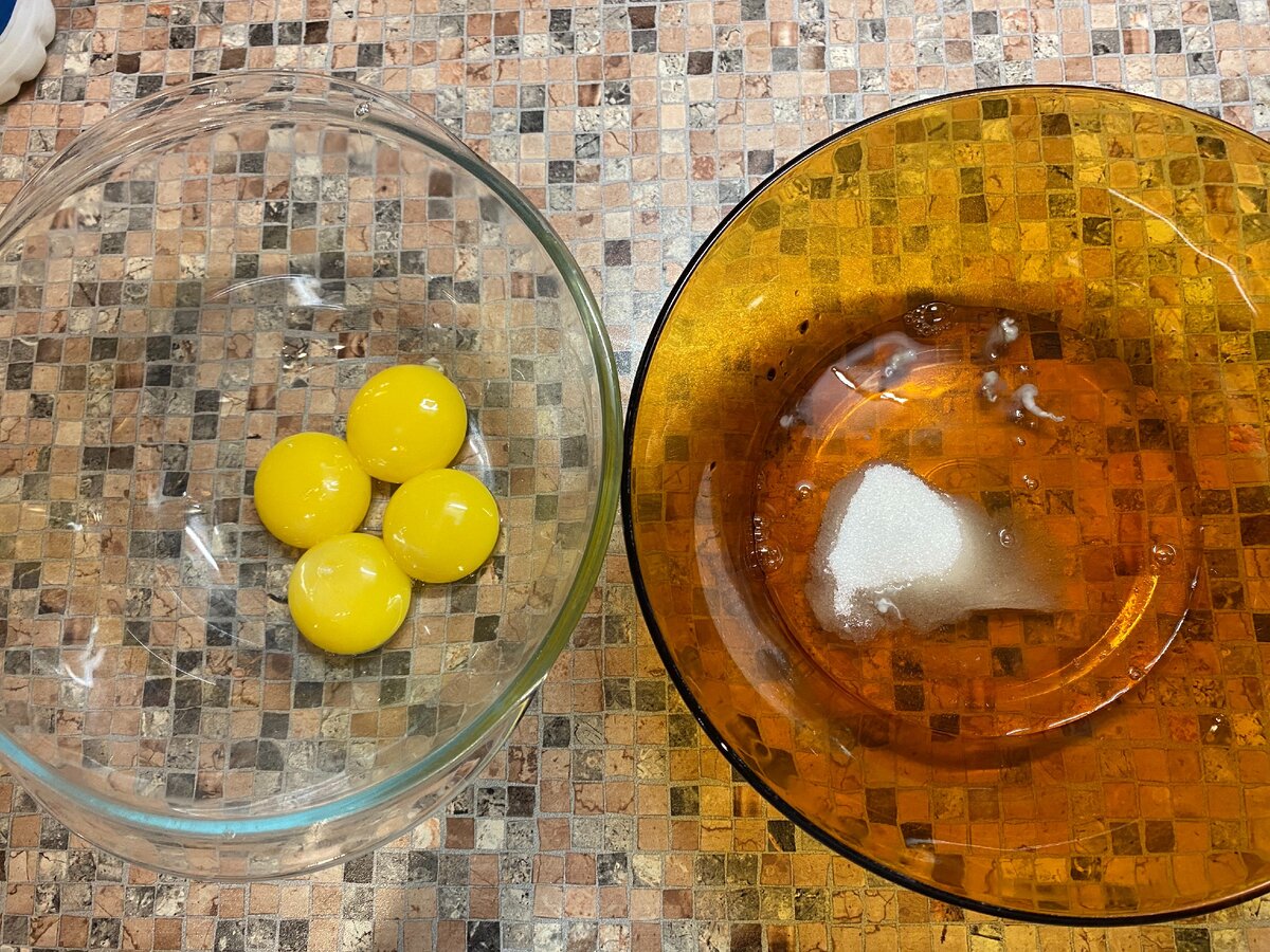 Отделяем белки от желтков. В белки сразу добавляем сахар.