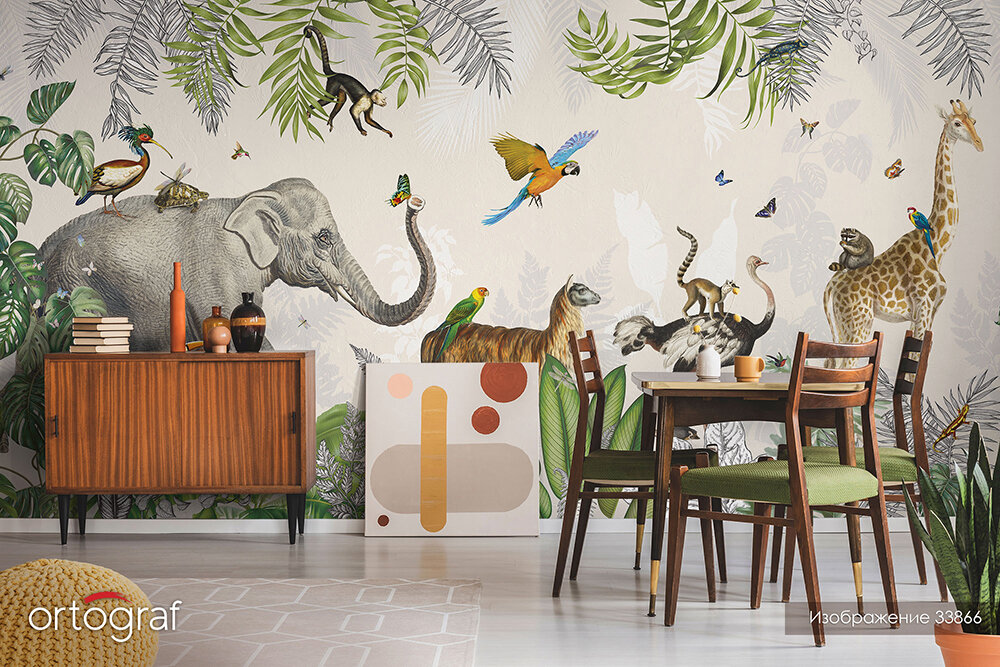 Цветочные и лиственные мотивы, густые дебри джунглей как никогда популярны. Если раньше в тропических дизайнах преобладали паттерны, то сейчас клиентов привлекает глубина сюжета. Это могут быть масштабные панорамы джунглей с уходящей вдаль перспективой, пальмы и фламинго, экзотические животные и цветы. Такие обои словно волшебный портал переносят нас из хмурых будней во влажный тропический лес или роскошный цветущий сад.