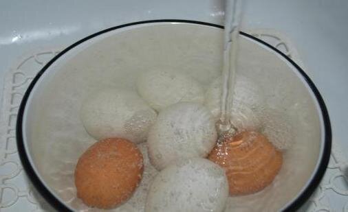 Отварную картошку измельчаем на тёрке. Ставим кастрюлю на огонь, кладём в неё яйца и засекаем 10 минут. Остужаем вареные яйца в проточной воде, после чего у них легко чистится скорлупа.