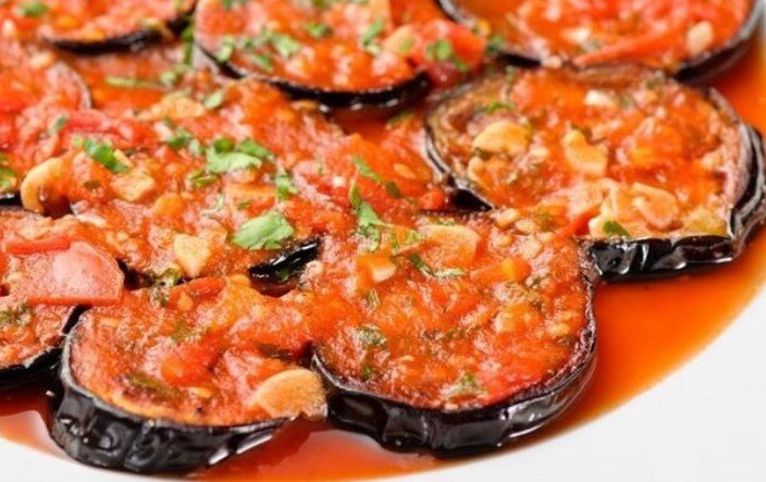 Необходимые продукты:баклажаны,морковь,лук,красные томаты,зелень петрушки,белые коренья,соль,масло подсолнечное,сахар,перец горький, перец душистый. Подготовленные баклажаны режут кружками шириной 10-20мм,укладывают на деревянную или сплетённую из лозы решетку,после чего с двух сторон слегка посыпают солью и оставляют на 20 мин для удаления горечи.кружки обваливают в муке и обжаривают в