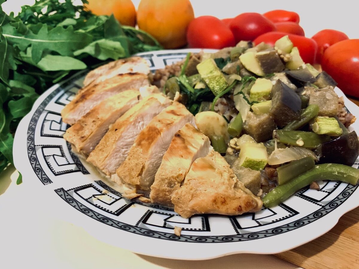 Первый раз готовила так куриные грудки и не пожалела: они получаются очень нежные и мягкие. В качестве гарнира - рагу из сезонных овощей и гречка.