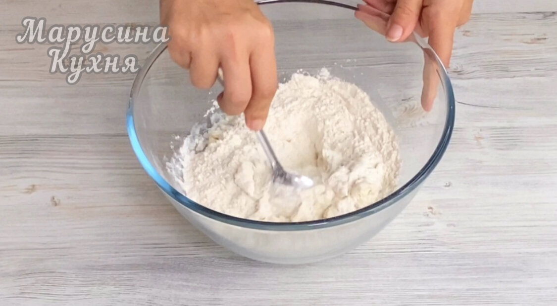 В чашу вливаю воду, растительное масло и добавляю соль. Размешиваю, растворяя соль. Постепенно ввожу муку. Сначала перемешиваю ложкой, а когда тесто становятся тугим, вымешиваю руками.