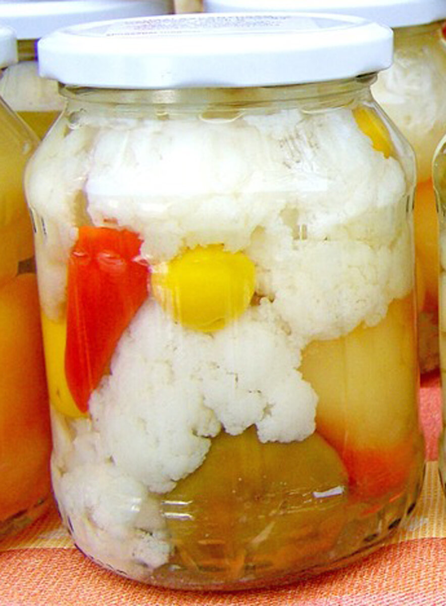 Нам понадобятся: цветная капуста – 2 кг, помидоры – 1,2 кг, растительное масло – 200 г, сахар – 100 г, соль – 60 г, чеснок – 80 г, перец болгарский – 200 г, петрушка – 200 г, уксус 9 % – 120 г.