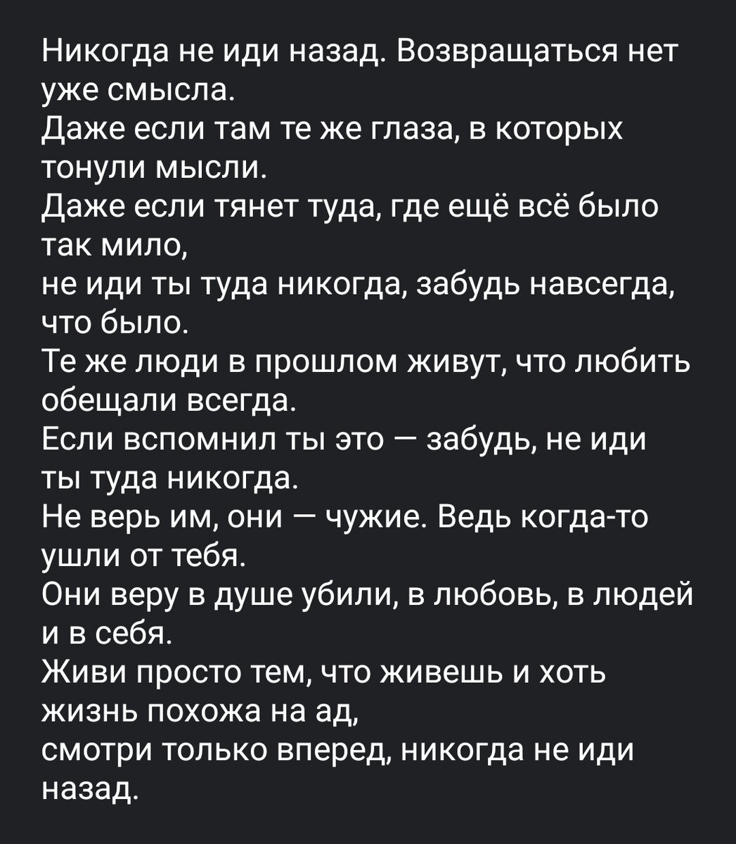Но стих правильно передаёт главную мысль - не иди назад. Действительно, как важно в такие моменты приходить в себя, чтоб было понимание того, что этого не стоит делать. Ведь люди не меняются, а истории повторяются. Если кто-то обещал любить и теперь не любит, то ничего хорошего дальше не будет, и остаётся только идти вперёд.