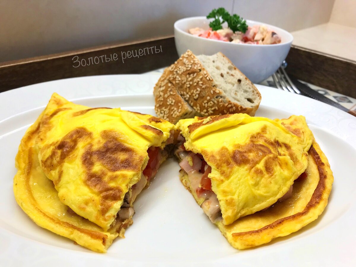 Это не просто рецепт начинки для омлета, но и вкусный и сытный салат. Приготовьте омлет с начинкой на завтрак или просто салат на обед или ужин. Ингредиенты: 300-350 гр. ветчины 200 гр. шампиньонов 200 гр. твердого сыра Сладкий красный перец 2 больших помидора Соль и перец На 2 порции омлета: 4 куриных яйца 3 ст. л. сметаны Как приготовить: 1. Сперва приготовим салат. Нарежьте ингредиенты на небольшие кусочки, а сыр натрите на крупной терке. 2. Посолите и поперчите по вкусу. Тщательно перемешайте. 3. Сделаем омлет. Взбейте яйца с солью и сметаной. 4. Разогрейте сковороду, влейте немного масла. Жарьте омлет под закрытой крышкой на среднем огне пока не подымется. 5. Переверните омлет, положите салат на одну половину и накройте второй. Выключайте плиту и дайте минуту постоять, чтобы сыр расплавился. Вот такой чудесный омлет с вкусной начинкой у меня получился. Обязательно попробуйте! Поставьте лайк, если вам понравился рецепт! Подписывайтесь на мой канал "Золотые рецепты" Также смотрите: