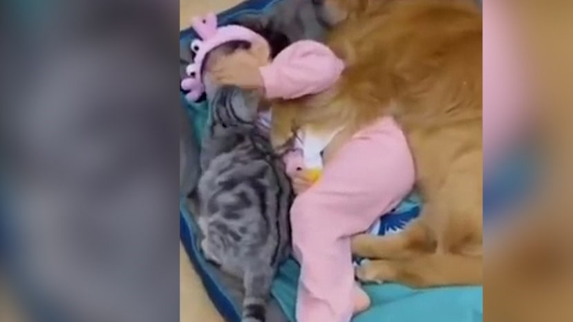 Нас отлично поймут все без исключения молодые родители: увидев своего малыша, попавшего в какую-нибудь забавную коллизию, так и тянет поскорее включить смартфон в режим видео и снять ролик для истории. Именно так и поступила мама из Китая, запечатлевшая свою малышку беспечно уснувшей между домашними питомцами – золотистым ретривером и дружелюбным симпатичным котиком.