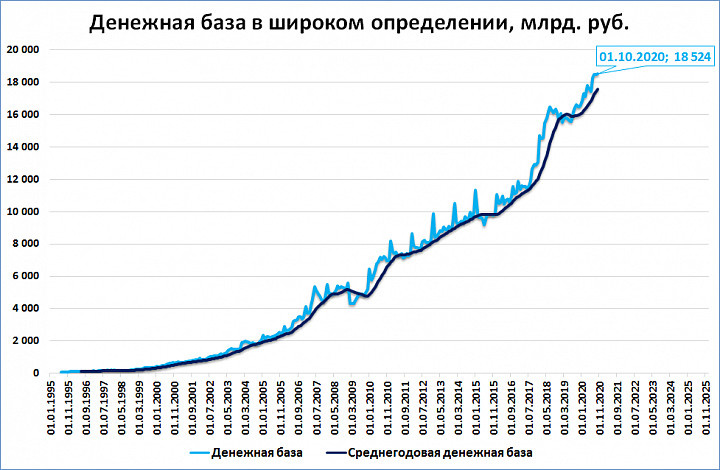 Это исторический рекорд - денежная база впервые превысила отметку 18,5 триллионов рублей (месяцем ранее, 1 сентября, 18,49 трлн.).