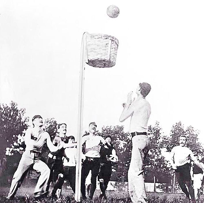 В 1891 году в Соединенных Штатах Америки молодой преподаватель, уроженец Канады, доктор Джеймс Нейсмит, пытаясь “оживить” уроки по гимнастики, прикрепил две корзины из-под фруктов к перилам балкона и предложил забрасывать туда футбольные мячи. Получившаяся игра лишь отдаленно напоминала современный баскетбол. Ни о каком ведении даже речи не шло, игроки перекидывали мяч друг другу и затем пытались закинуть его в корзину. Побеждала команда, забросившая большее количество мячей.