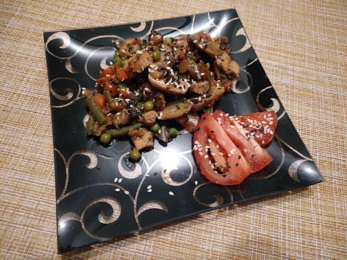Изумительное блюдо с подсчетом калорий! Не подумайте, раз с подсчетом калорий, значит блюдо диетическое. Блюдо обалденное! Обычно это блюдо готовится на сковороде вок. Именно она, за счет равномерного прогрева, позволяет молниеносно приготовить такой ужин. Но можно воспользоваться жаровней, сотейником или глубокой сковородой – все равно получится быстро, вкусно и полезно.