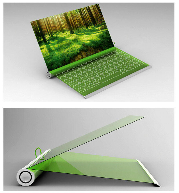 У ноутбука Plantbook гибкий дисплей, сенсорная клавиатура, и… он сворачивается в трубочку! Также для его зарядки можно не просто использовать обыкновенную солнечную энергию, но и