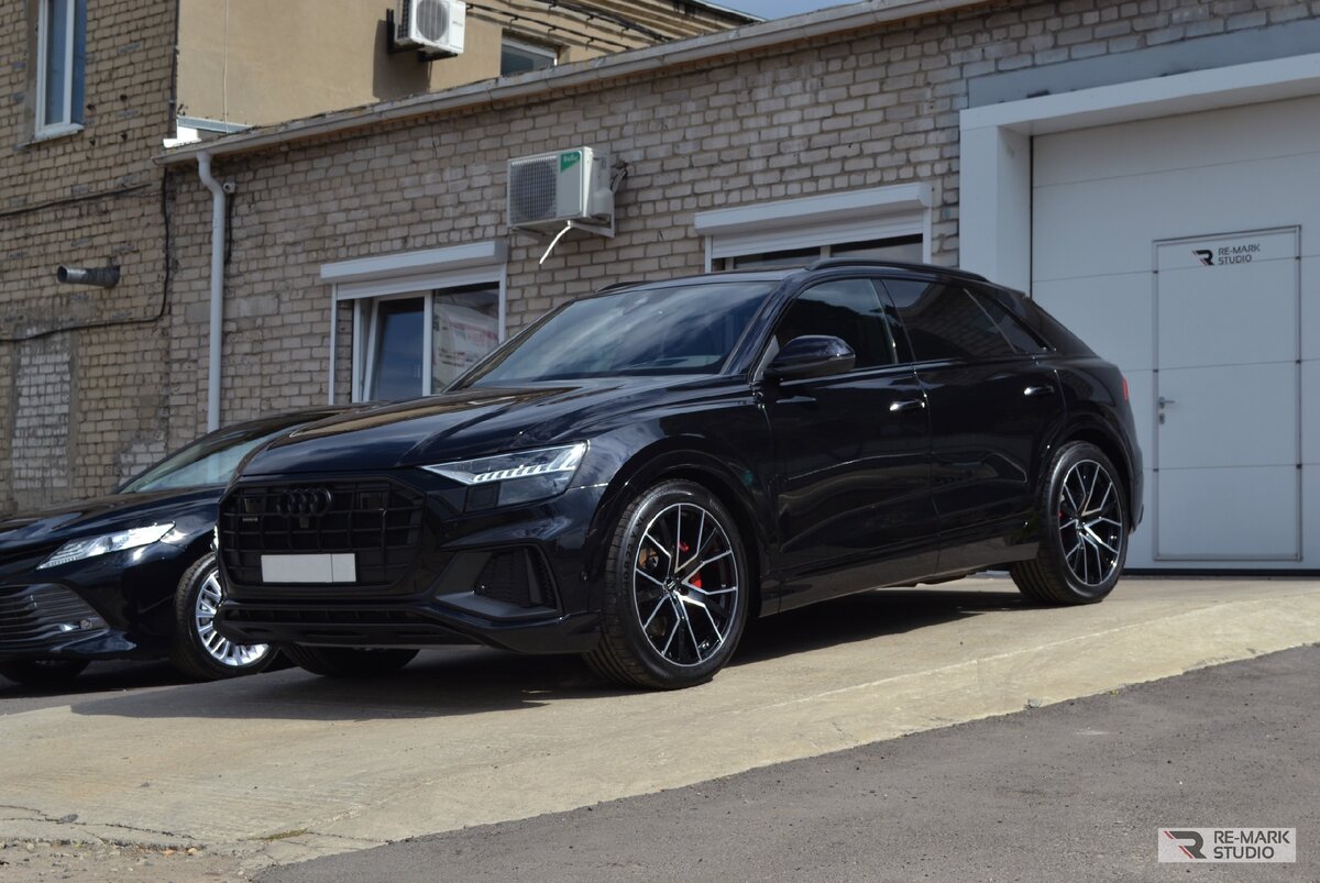 Для оклейки машина не разбиралась. Мы резали пленку на плоттере строго под размер детали и монтировали без резки по месту. Эстетика идеальная. Все открытые кромки имеют безупречный ровный край. На экраны в салоне мы установили