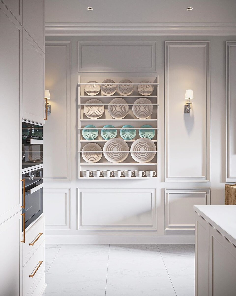 Гарнитур специально выбран молочно-белый в неоклассическом стиле. Шкафы под потолок и строгий цоколь только подчёркивают красоту линий и форм. Также дизайн кухни перекликается со стеновыми панелями.