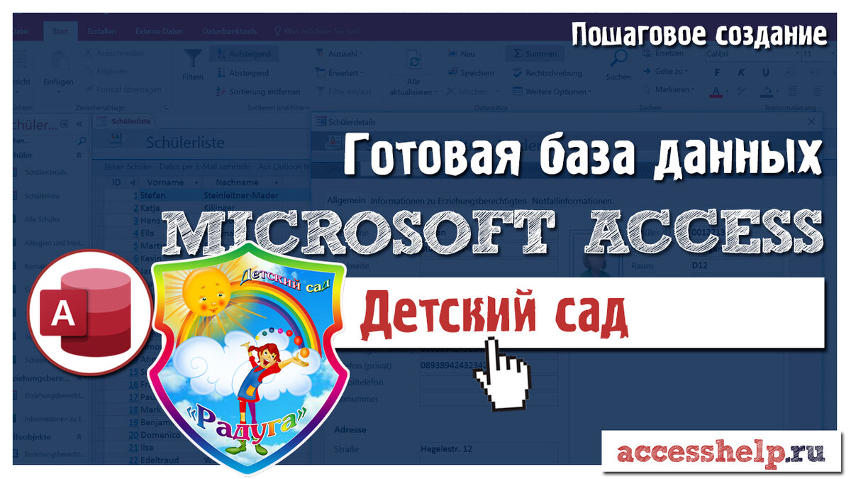 Готовая база данных Access Детский сад состоит из 3 таблиц, 6 запросов, 3 форм, 7 отчетов + главная кнопочная форма. Все что от вас потребуется это смотреть видео с пошаговым созданием БД и повторять на своем компьютере.