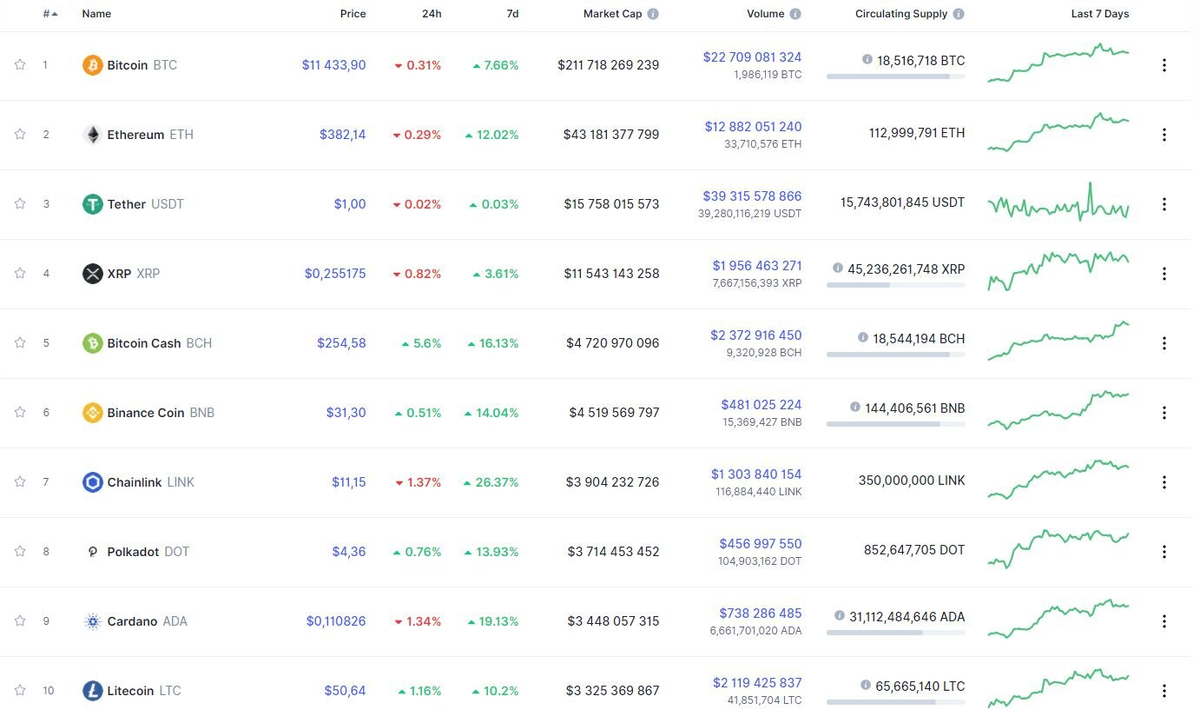 Большинство криптовалют из топ-10 рейтинга капитализации ресурса CoinMarketCap начали среду с падения. По состоянию на 11:16 (МСК), bitcoin торгуется по $11 433. За сутки курс актива упал на 0.31%. При этом динамика движения BTC в течение недели осталась позитивной (+7.66%).