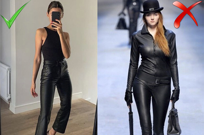 При неправильном их сочетании, такие вещи способны опошлить любой образ. Если вы любите кожу, кто отдавайте предпочтение не облегающему, а более свободному крою. Да и к тому же, кожаные вещи, трещащие по швам, являются абсолютным антитрендом.