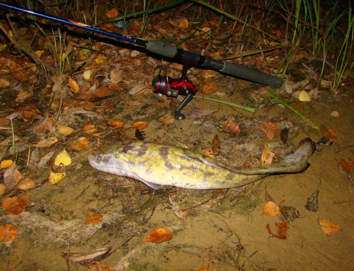 А на самом деле приоткрываю глаз и щурюсь от света налобного фонаря)) и сквозь сон слышу как звенит колокольчик))...Вскакиваю как ошпаренный и несусь через все удочки не понимая какая звенит)) Свечу фонарем по сторонам и замечаю как колокольчик на одном из спиннингов провис, спадает к земле и в сторону берега...АГА ... кто-то клюнул и тащит приманку к берегу... Подбегаю, хватаю, подматываю и делаю резкую подсечку, колокольчик слетел, потом еле нашел)) На том конце заводило что-то увесистое, радости не было предела...