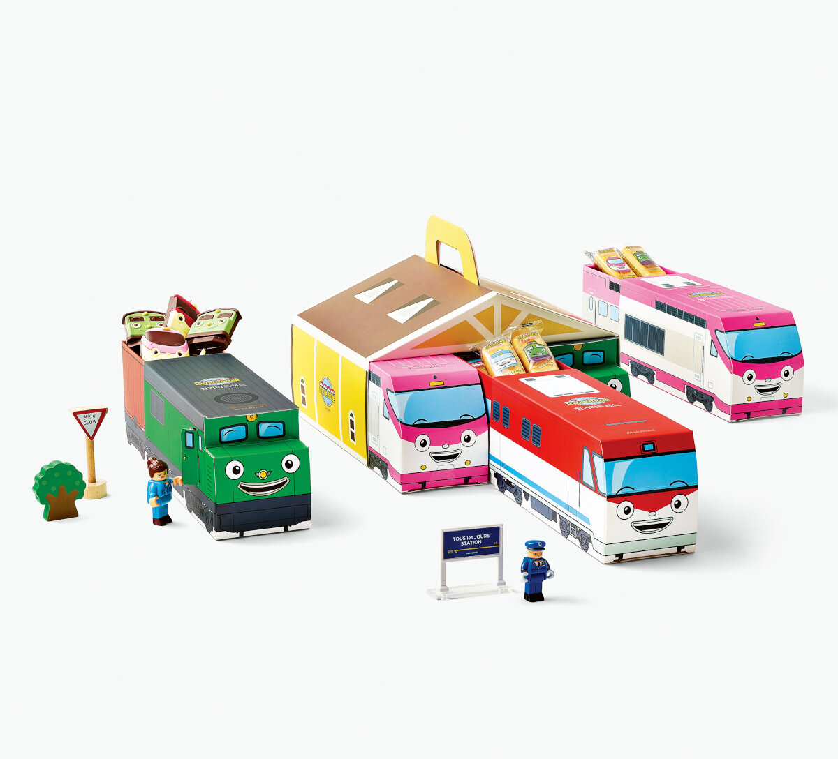 Привлекательная упаковка этих хлебобулочных изделий ориентирована на детей. Коробки для пирогов выполнены в виде трех пассажирских поездов, заполненных Madeleines (небольшой сочный пирог, обычно выпекаемый в форме в форме ракушки и часто украшенный кокосовой стружкой и джемом.). Они дополняются двумя большими коробками, выполненными в виде ангаров (два варианта оформления), в которые помещаются два таких поезда. Для удобства транспортировки коробка-ангар снабжена ручкой.