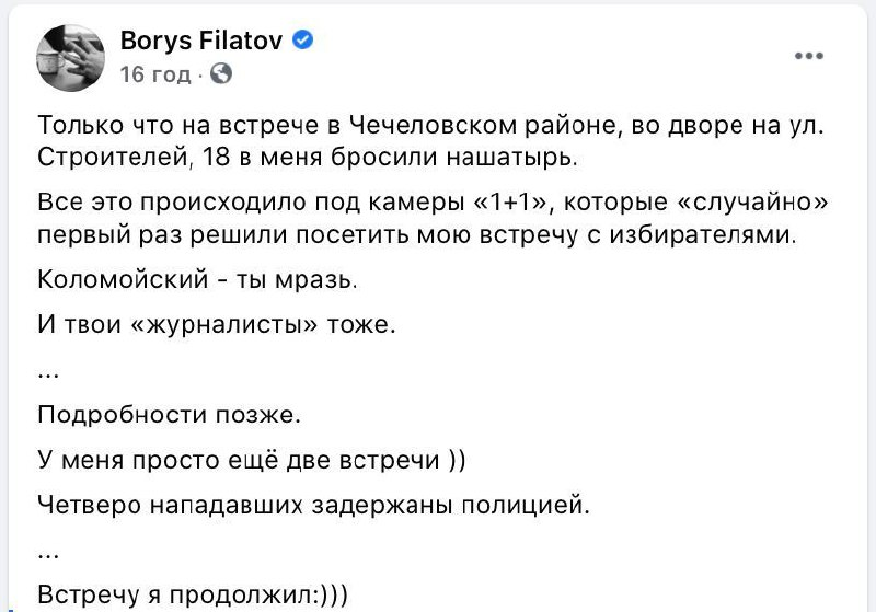 Предвыборная ситуация в Днепре накаляется. Во время встречи с избирателями в Бориса Филатова кинули нашатырь. Тот обвинил Коломойского в организации этой провокации и назвал его мразью, после чего накатал длиннющий пост-обращение к Зеленскому, в котором попросил того вмешаться в ситуацию.
