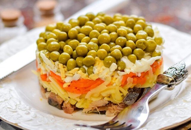 Скумбрию разделать на филе, очистить от костей, снять кожицу, нарезать мелким кубиком. Картофель, морковь, яйца отварить, очистить. В салатницу выложить слоями: скумбрия(майонез) - картофель на мелкой терке(майонез) - морковь на мелкой терке(майонез) - яйца и сыр на мелкой терке(майонез) - зеленый горошек. Салат поставить в холодильник на 2-3 часа для пропитки.