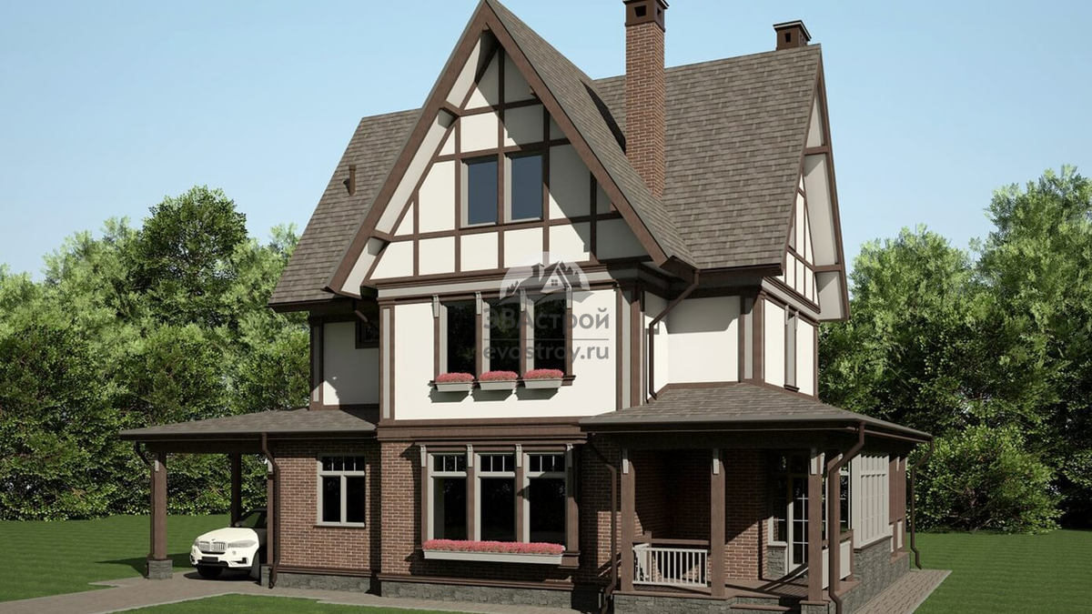 Проект трехэтажного дома из кирпича с мансардой и навесом