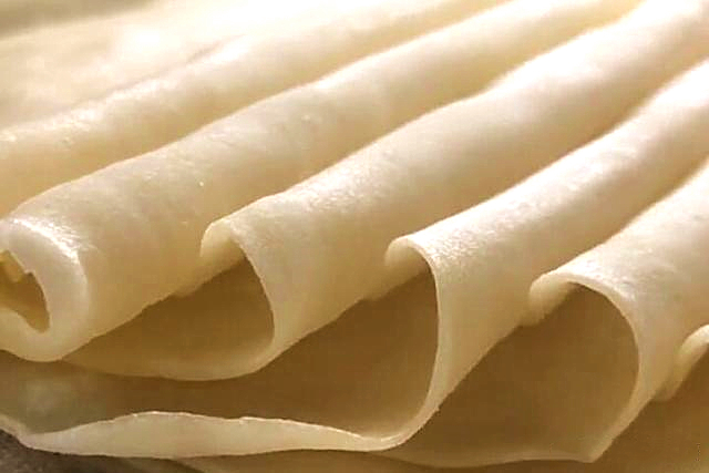 Шаг №3: Блинницу или кастрюлю разогреть, смазать тонким слоем кукурузным маслом, положить ложку теста на сковородку пока тесто не затвердевает, но так что бы рисовая паста равномерно растеклась на кастрюле, обе жарить около 60 секунд, чтобы длины были особенно тонкие, готовиться очень быстро.