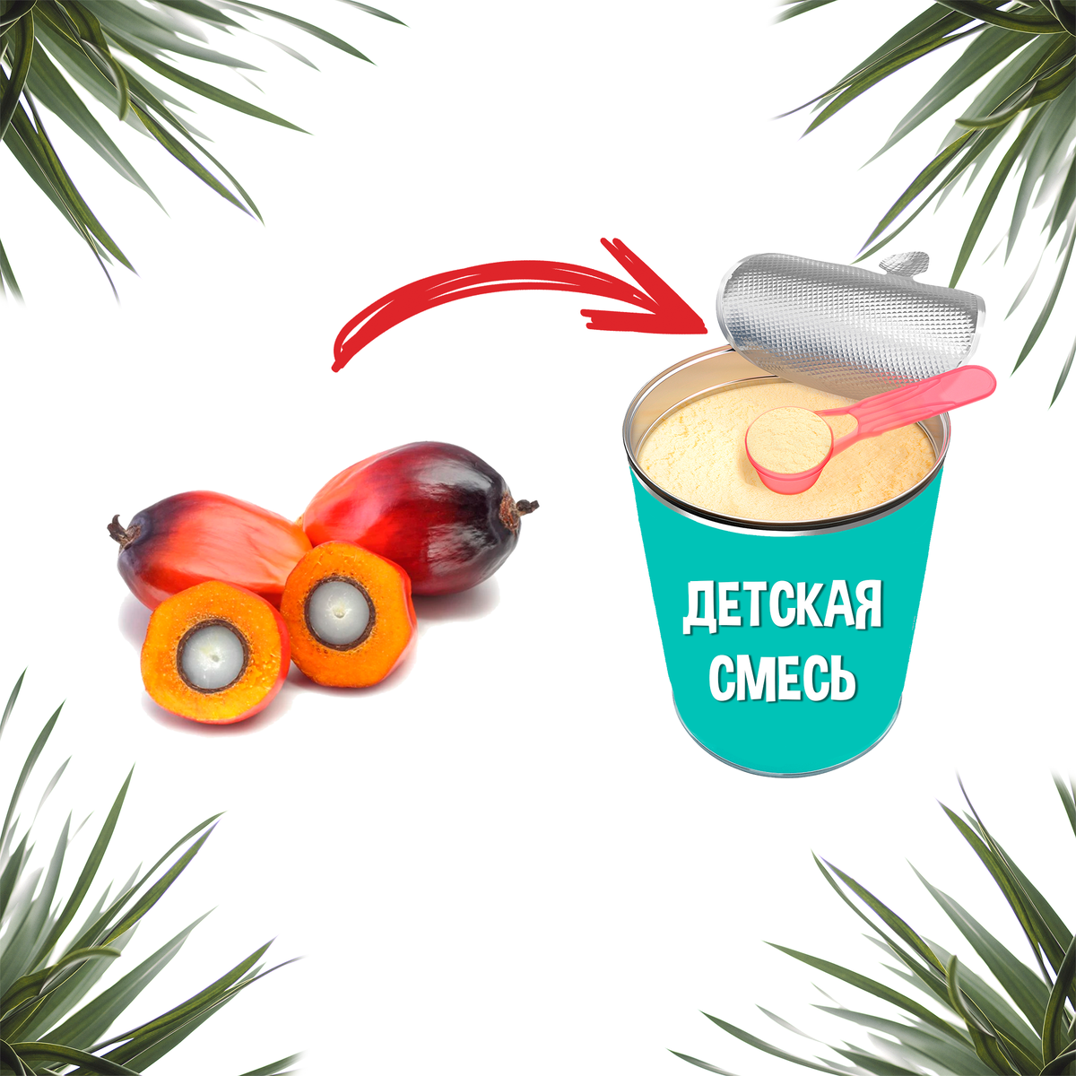 - Основа жиров ПАЛЬМОГО МАСЛА составляет пальмитиновая кислота (которая содержится так же в молочном жире, масле чёрного кофе и грудном молоке ), именно она и является причиной включения пальмового масла в заменители грудного молока!