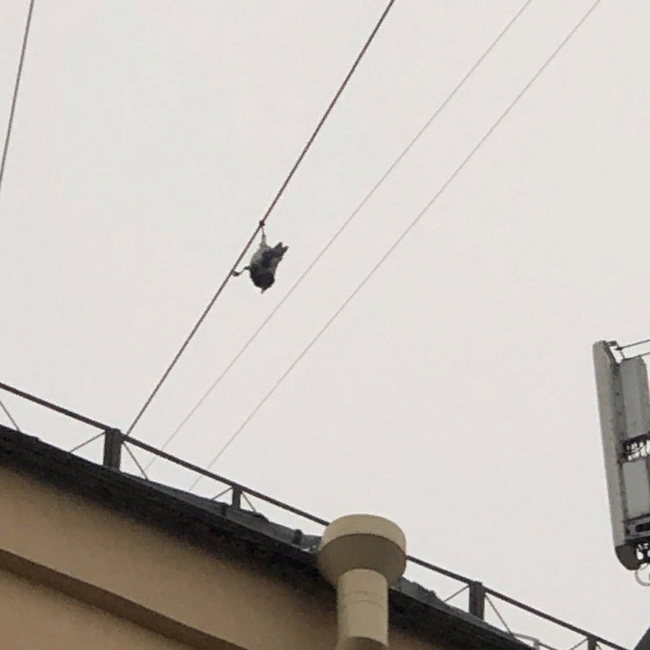 Пользователь твиттера с ником kaminoryuu стала свидетельницей довольно странного зрелища. Девушка живет в Санкт-Петербурге. Однажды она вышла покурить и заметила на одном из электрических проводов над крышами домов ворону. Правда, в не самой привычной позе. Птица висела на проводе вверх лапами!
