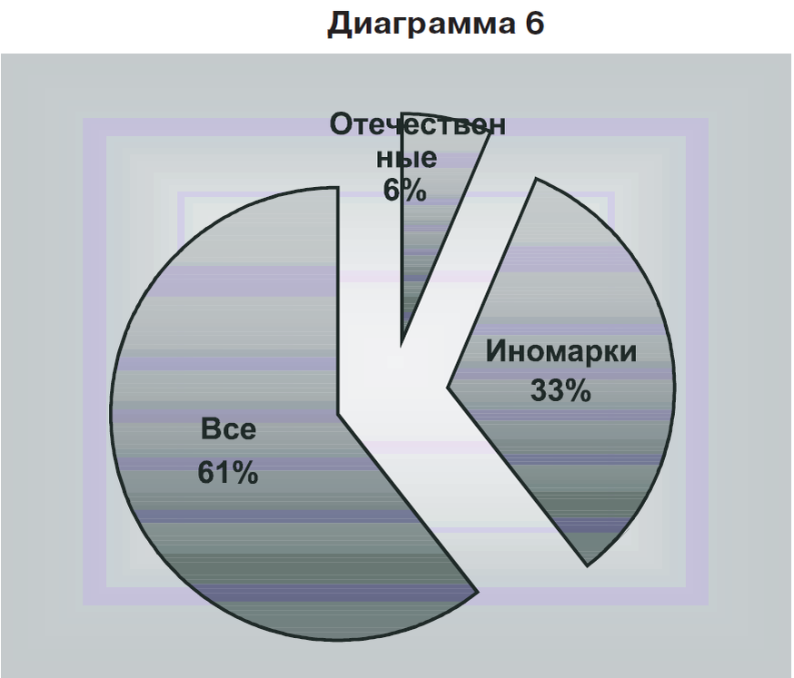 Большое внимание при исследовании уделялось инструменту и оборудованию. На сегодняшний день на СТО Новосибирска используется более тридцати различных марок инструмента (Диаграмма 10). Наиболее сильные позиции занимает STANLEY, KING-TONY, HAZET, FORCE, BILTEMA, YATO, TOPEX, инструмент производства СНГ (73% от всего используемого инструмента). Как видно, это в основном инструмент производства Тайваня, Германии (HAZET) и Китая (TOPEX). Надо отметить, что дилерские станции безбоязненно приобретают инструмент тайваньского происхождения, считая его достаточно надежным.