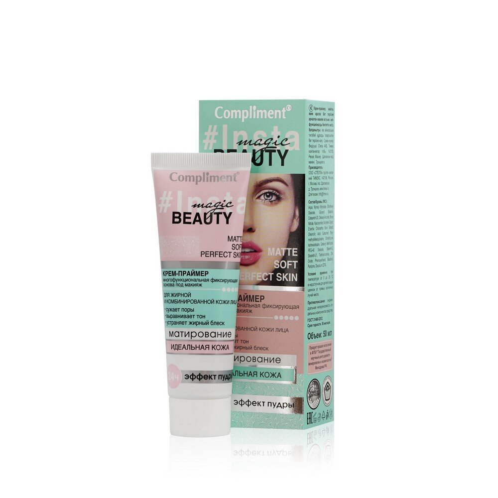 1. Комплемент. Insta magic beauty matt soft perfect skin крем-праймер. Многофункциональная фиксирующая основа под макияж. Для жирной и комбинированной кожи лица. Сужает поры, выравнивает тон, устраняет жирный блеск. Матирование. Идеальная кожа. 24 часа эффект пудры, 50 мл.