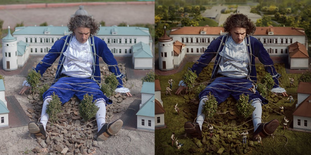 Очевидным было то, что в кадре не хватает дополнительных персонажей, и было решено с помощью коллажирования добавить лилипутов. Поэтому мне пришлось отснять дополнительную съемку, где роль лилипута играл один из участников команды — Юра. Лилипутов нужно было отснять в соответствующих ракурсе и освещении. Я попросила модель прыгать, убегать, бояться, бороться, тянуть веревку и прочее. Несколько часов в Photoshop — и персонажи готовы. Так как на протяжении всей съемки лилипут был одет в один костюм, на картинке пришлось несколько разнообразить его одежду.