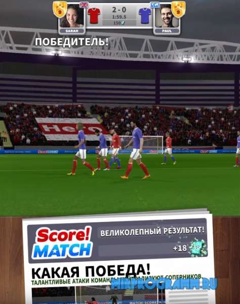 Score! Match – интересная футбольная игра с качественной трёхмерной графикой, множеством уровней и участием реальных онлайн-игроков. Является точным подобием настоящего футбола со спортсменами, правилами, разнообразными аренами, матчами, достижениями, улучшениями и кубками.