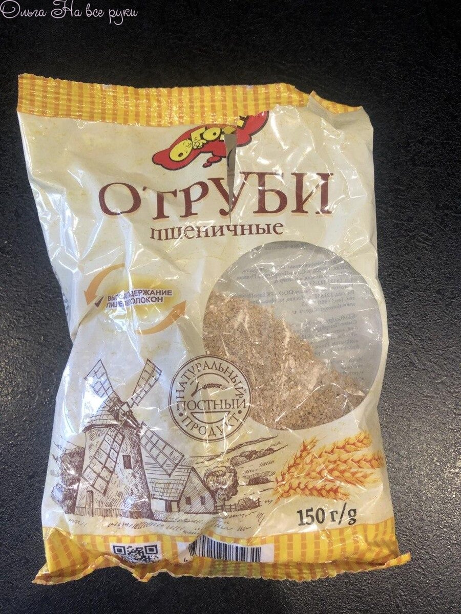 Мы очень любим хлеб с отрубями. Отруби покупаю самые обычные: и пшеничные, и ржаные, и овсяные. Обычно они продаются в отделах здорового питания. Мои отруби весят 150 гр, этого количества хватает на 3 замеса.