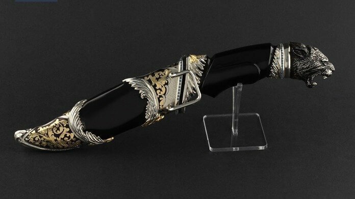 Цена — 8 150 долларов или 519 395 рублей. Несмотря на то, что этот инструмент имеет форму охотничьего ножа, многочисленные украшения делают его скорее декоративным предметом, который органично смотрится на витрине магазина, рядом с другими предметами роскоши. Лезвие Black Panther Knife сделано из дамасской стали с рукояткой из орехового дерева, на которой красуется миниатюрная голова пантеры.
