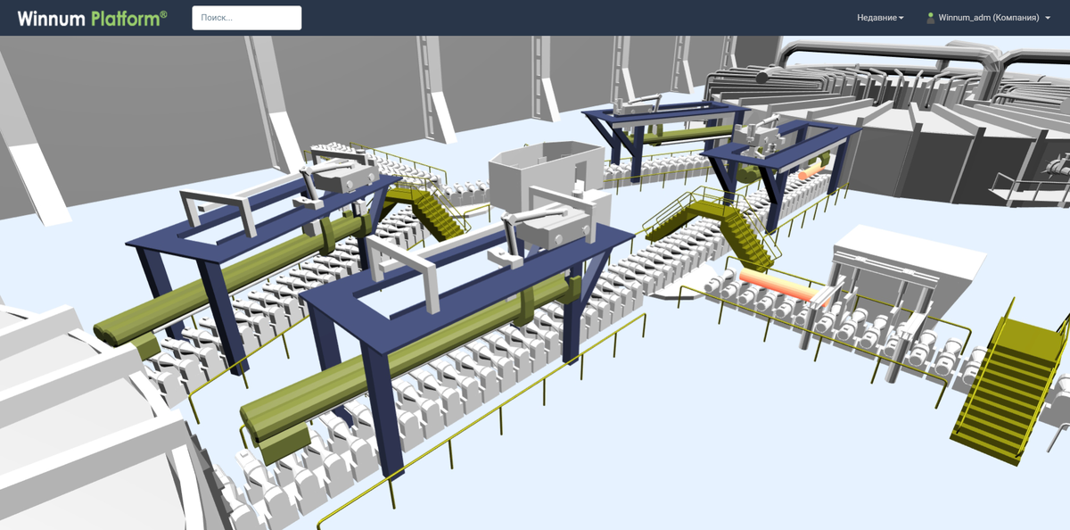 Использование интерактивного цифрового двойника, работающего на основе Big Data, начинается с его создания и обучения. При создании используются 3D модели, созданные в любых САПР, или геометрия, созданная непосредственно в WINNUM 3D Editor. Степень детализации трехмерной сцены определяется автоматизируемыми процессами, при этом создается целый трехмерный мир с широким набором инструментов по работе со светом, текстурами, пользовательскими камерами, механизмом взаимодействия с объектами и т.п. Объекты, размещенные на 3Dсцене, в свою очередь, связываются с сигналами и данными, хранимыми в WINNUM Cloud и для каждого из них описываются сценарии поведения в зависимости от значений сигналов, включая изменение цвета, положения объекта или его компонентов, появление информационных сообщений и т.д.