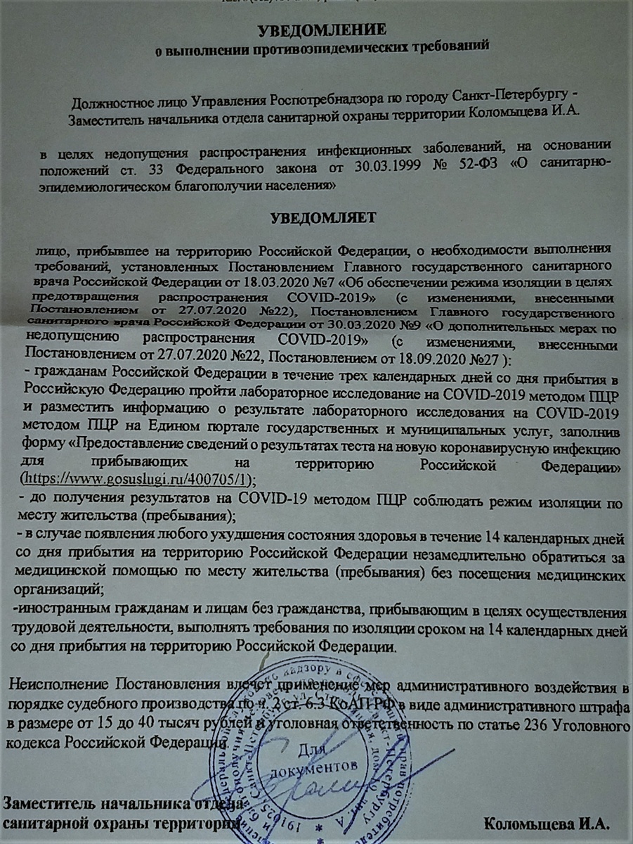 Все пассажиры на обратном пути заполнили анкеты и получили в аэропорту Пулково уведомление от Роспотребнадзора. Совершенно без всяких проволочек я забрала свой багаж и отправилась домой. А на следующий день сдала анализ ПЦР в Хеликсе. Через 3 дня получила электронное сообщение с отрицательным результатом и загрузила на Госуслугах. После этого уже вышла на работу в обычном режиме. Как говорится "не так страшен черт..."