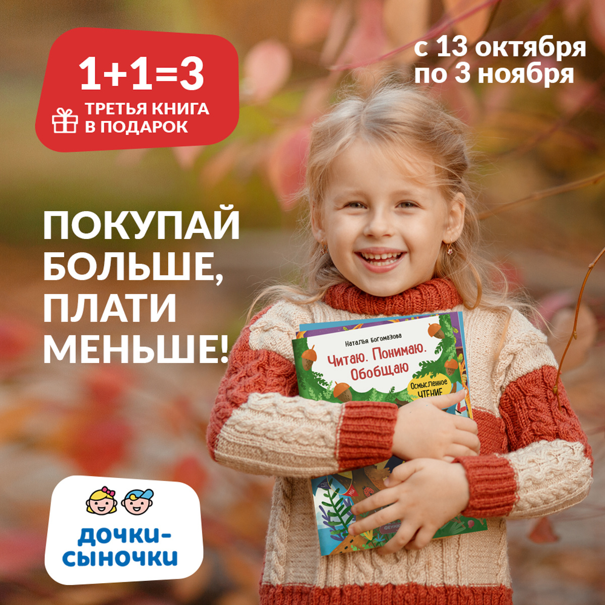 С 13 октября по 3 ноября в интернет-магазине dochkisinochki.ru проходит акция: при покупке 2-х детских книг «Феникс-Премьер» третью вы получаете БЕСПЛАТНО!🛒🌟