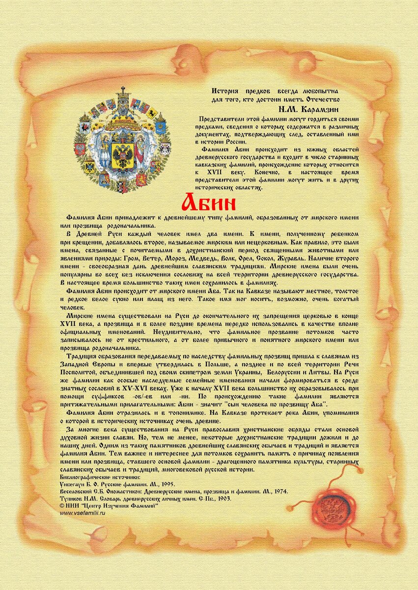 За многие века существования на Руси православия христианские обряды стали основой духовной жизни славян. Но, тем не менее, некоторые дохристианские традиции дожили и до наших дней. Одним из таких памятников древнейших славянских обычаев и традиций и является фамилия Абин. Тем важнее и интереснее для потомков сохранить память о причинах появления имени или прозвища, ставшего основой фамилии - драгоценного памятника культуры, старинных славянских обычаев и традиций, многовековой русской истории.