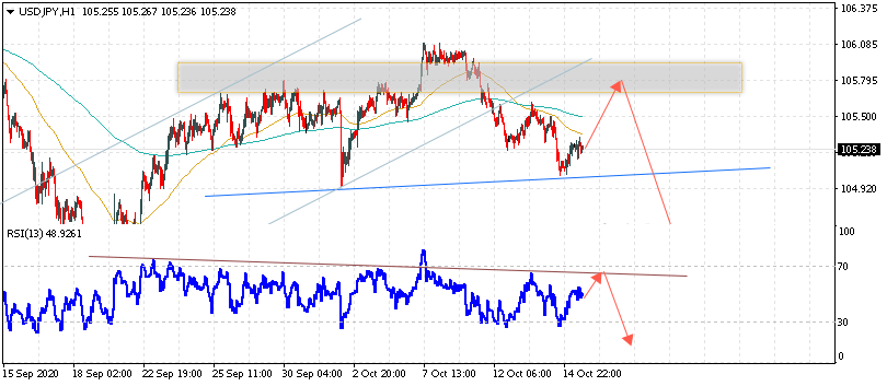Дополнительным сигналом в пользу падения валютной пары USD/JPY выступит тест линии сопротивления на индикаторе относительной силы. Вторым сигналом станет отскок от нижней границы восходящего канала. Отменой варианта падения валютной пары Доллар Иена станет сильный рост и пробой уровня 106.25. Это укажет на пробой области поддержки и продолжение роста пары Доллар Иена. В этом случае стоит ожидать продолжение подъёма пары в область выше уровня 107.75. С пробоем области поддержки и закрытием котировок ниже уровня 104.75 стоит ожидать подтверждения развития нисходящего движения по паре.Важных новостей из Японии, которые могут оказать влияние на курс пары USD/JPY, не ожидается, поэтому пара продолжит движение в рамках технического анализа.Таким образом, USD/JPY прогноз Доллар Иена на 16 октября 2020 предполагает попытку теста области сопротивления вблизи уровня 105.75. Затем, продолжение падения котировок в область ниже уровня 104.05. В пользу снижения пары выступит тест линии тренда на индикаторе относительной силы. Отменой варианта падения станет сильный рост и пробой области 106.25. Это укажет на пробой уровня сопротивления и продолжение роста по паре с потенциальной целью выше уровня 107.75.