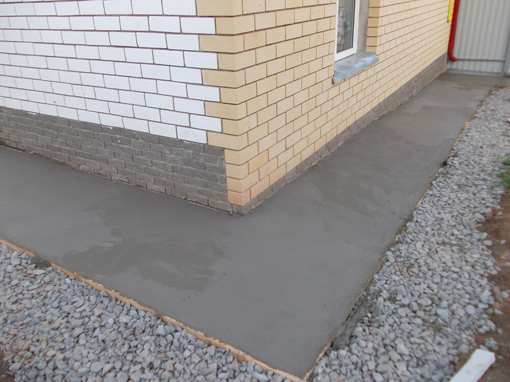 Тут надо быть умнее и подходить к вопросу объективно: по моему мнению отмостка нужна по факту для удлинения пути фильтрации осадков, чтобы можно было максимально отвести количество воды от подошвы фундамента и избежать его размачивания. То есть по факту отмостка — это обречённая изначально конструкция, которая чтобы вы не делали обязательно потрескается и опуститься в жару от оттаивания после зимы или же наоборот в мороз распучится. Ей не нужно уделять фанатичное внимание, как у нас многие строители это делают, гораздо проще сделайте её эстетично дешево и практично, но естественно не в ущерб функциональности. И поскольку это временная конструкция сюда ненужного лить огромные суммы.