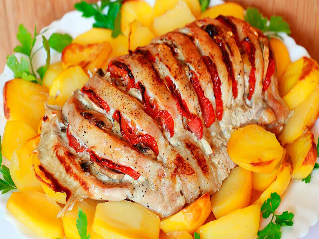Мясо свинины промываем и затем обрушиваем. Надрежьте мясо но не до самого конца поперек на ломтики не толще 1 см. Смешиваем соевый соус, перец, соль и любые приправы по вашему вкусу. Смажьте приготовленной смесью