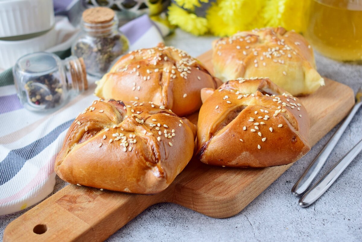 Каждую булочку смажьте по всей поверхности верха яичным желтком и посыпьте небольшим количеством кунжута.